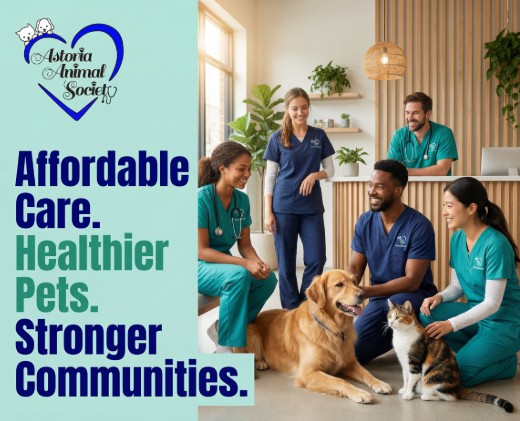 Astoria Animal Society is a compassionate, community-centered nonprofit veterinary clinic dedicated to improving the lives of pets and the people who love them. Rooted in accessibility, education, and preventive care, we work to ensure that every pet—regardless of circumstance—has the opportunity to live a healthy, safe, and loved life.